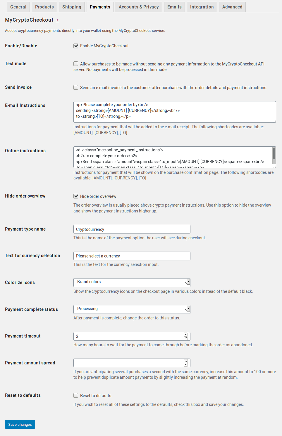WooCommerce requires very little configuration to use MyCryptoCheckout as a payment gateway.